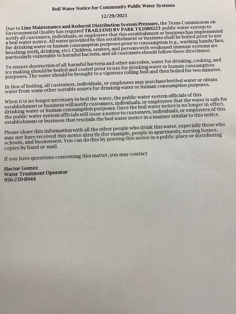 Please see attached water boil notice,as required by the TCEQ. This is related to the scheduled water shutoff today 12/29/21 at 9AM Image December 29, 2021Trails End Share this: Click to share on X (Opens in new window) X Click to share on Facebook (Opens in new window) Facebook Like Loading... Related