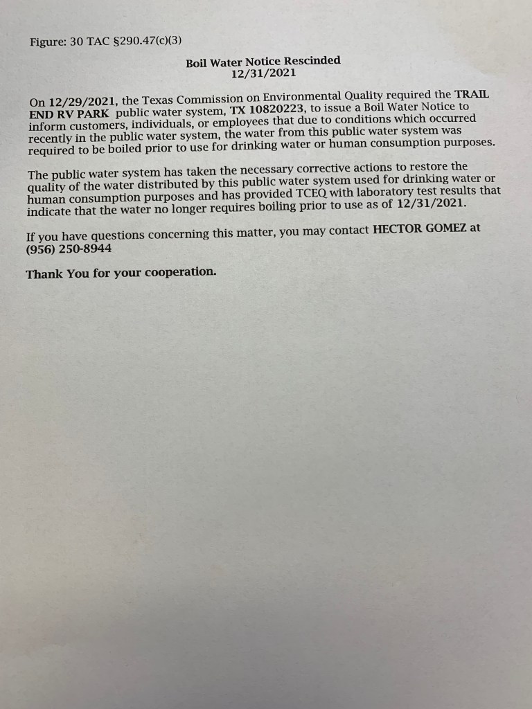 Boil Water Notice Rescinded Image December 31, 2021Trails End Share this: Click to share on X (Opens in new window) X Click to share on Facebook (Opens in new window) Facebook Like Loading... Related