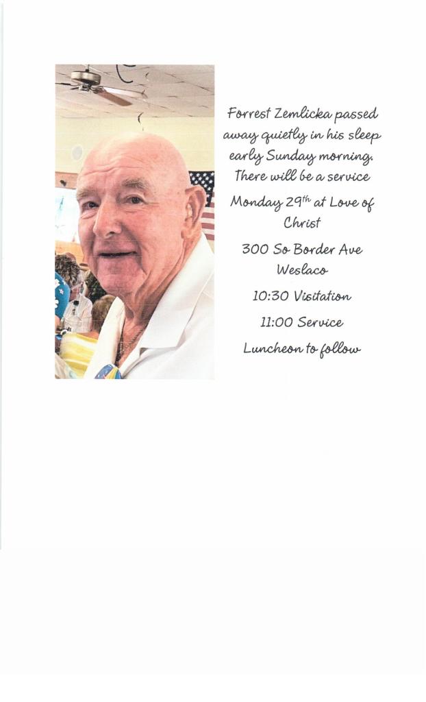 In memory of Forrest Zemlicka January 24, 2024Trails End Thank you for your service. Share this: Click to share on X (Opens in new window) X Click to share on Facebook (Opens in new window) Facebook Like Loading... Related