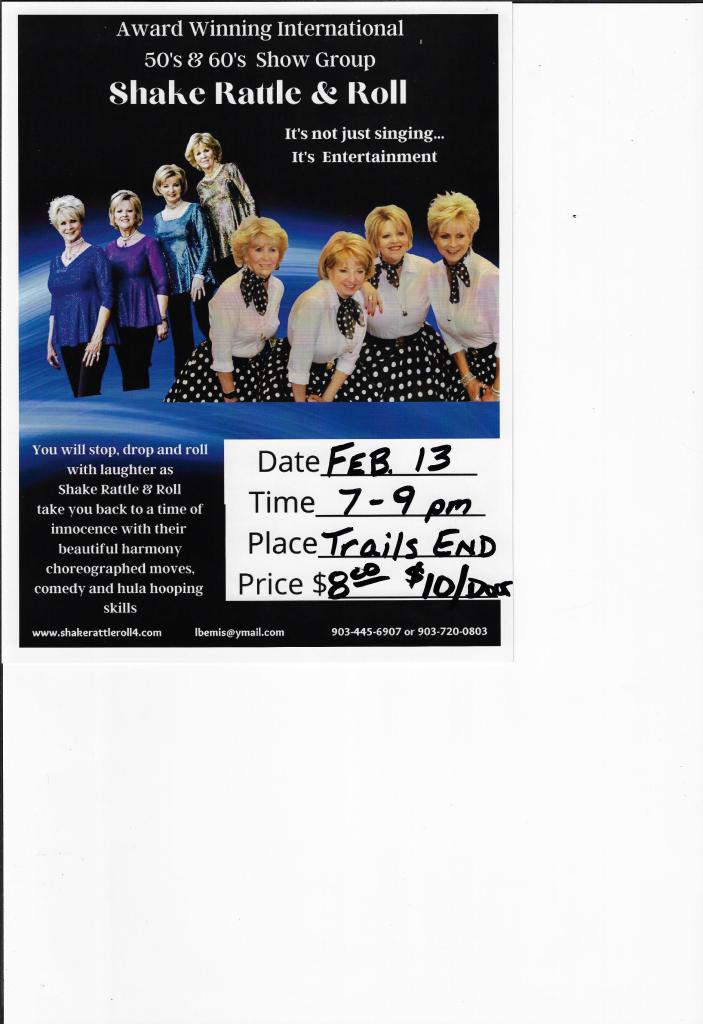 Shake Rattle & Roll tickets on sale now February 8, 2024Trails End Tickets for Tuesday Feb. 12 7:00pm show on sale now. Share this: Share on X (Opens in new window) X Share on Facebook (Opens in new window) Facebook Like Loading... Related