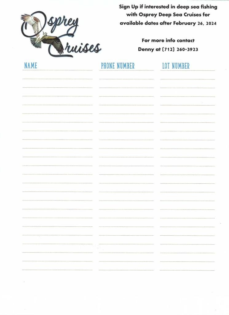 Osprey Deep Sea Fishing Cruise February 21, 2024Trails End Sign Up sheet for dates after Feb 26th is up now in the main hall if interested in a deep sea fishing cruise. Share this: Click to share on X (Opens in new window) X Click to share on Facebook (Opens in new window) Facebook Like Loading... Related