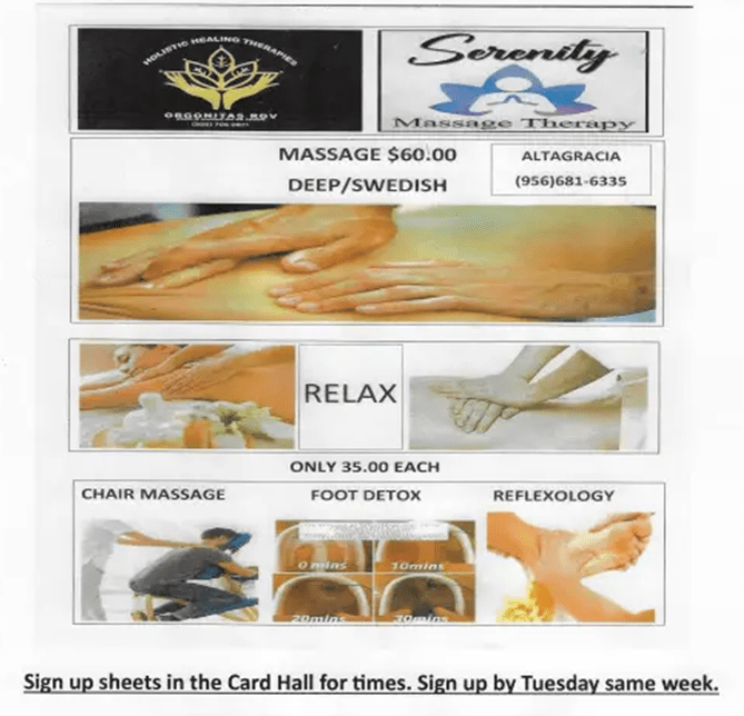 Massage sign up for tomorrow Wednesday, March 13th is in the card hall. They will check after 3 today to see who has signed up.