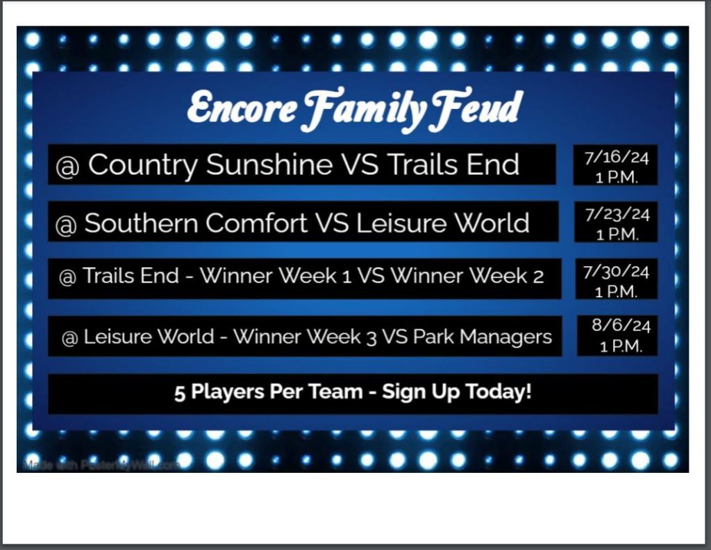 Hey there! Just a friendly reminder that today is the last day to sign up for Family Feud. We’re hoping to gather a team of 5 to challenge the folks from Leisure, Country Sunshine, and Southern Comfort. Don’t miss out on the chance to join in on the fun!