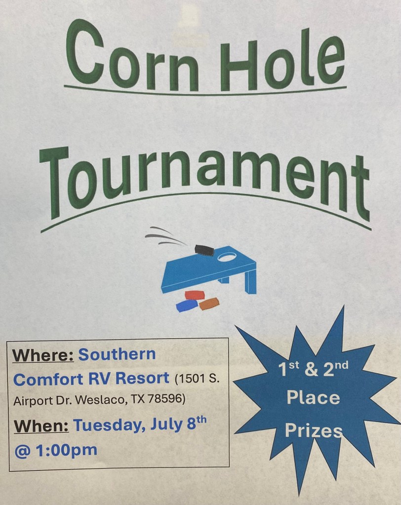 Corn Hole Tournament at Southern Comfort July 8th at 1pm.
