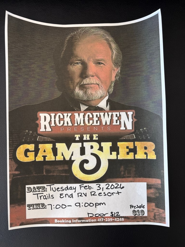 The Gambler tomorrow from 7-9 PM stop by the office for your tickets Presale $10 Door $12