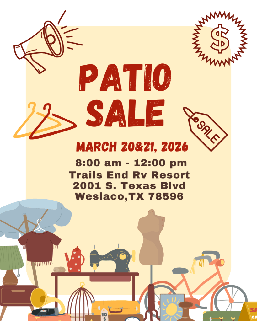 Patio Sale March 20 & 21 !! March 2, 2026Trails End We will be having a patio sale on March 20 & 21 from 8am-12pm, OPEN TO THE PUBLIC! There will not be a table distribution!! Share this: Share on X (Opens in new window) X Share on Facebook (Opens in new window) Facebook Like Loading... Related
