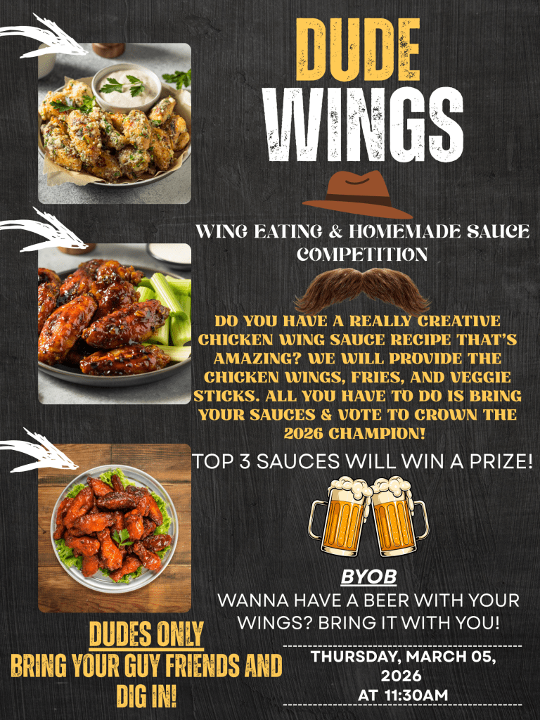 DUDE WINGS March 4, 2026Trails End Today’s the last day to sign up for DUDE WINGS, sign-up sheet is in the Main hall & will be picked up at 12:00pm Today !! Share this: Share on X (Opens in new window) X Share on Facebook (Opens in new window) Facebook Like Loading... Related