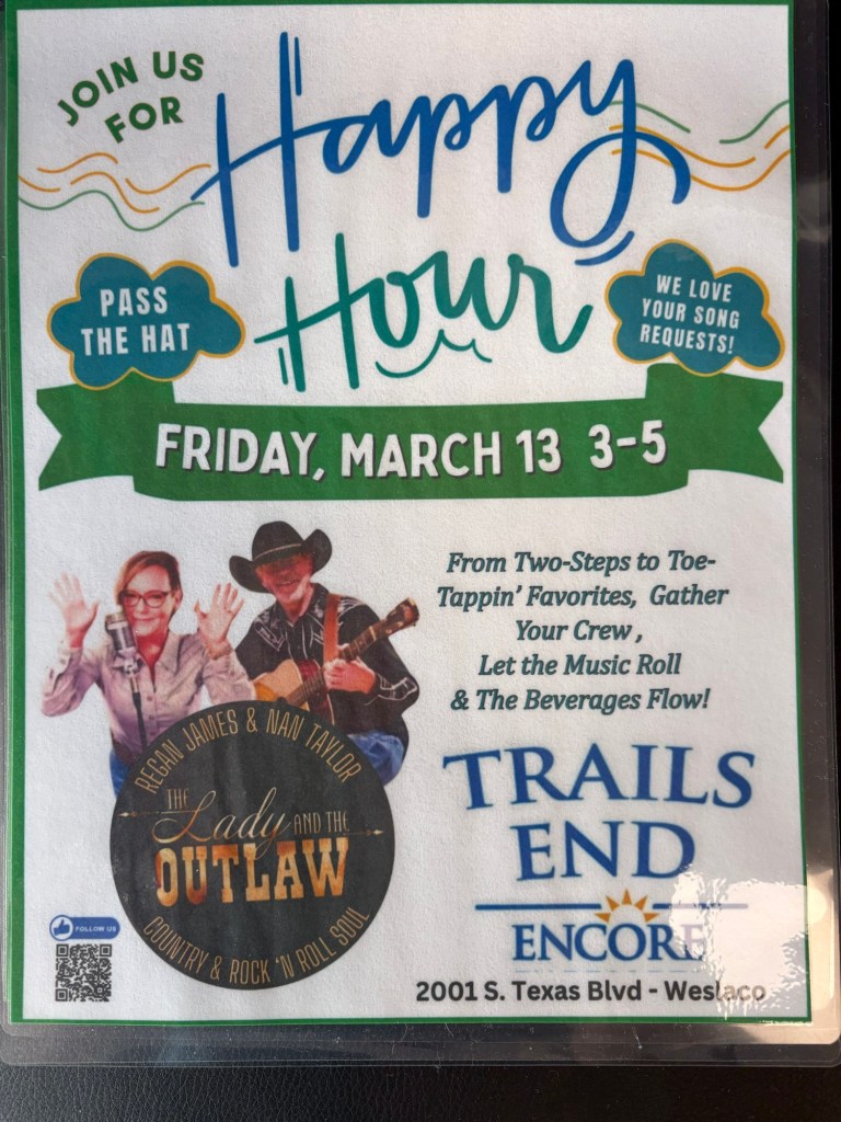 Join us tomorrow for happy hour from 3-5PM “Nan Taylor “ March 12, 2026Trails End Share this: Share on X (Opens in new window) X Share on Facebook (Opens in new window) Facebook Like Loading... Related