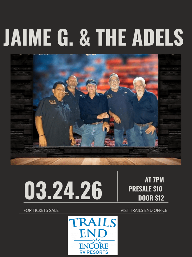 Last concert of the season, stop by the office for your tickets. Presale $10 Door $12. March 23, 2026Trails End Come out & support our very own resident “Roy.” Share this: Share on X (Opens in new window) X Share on Facebook (Opens in new window) Facebook Like Loading... Related